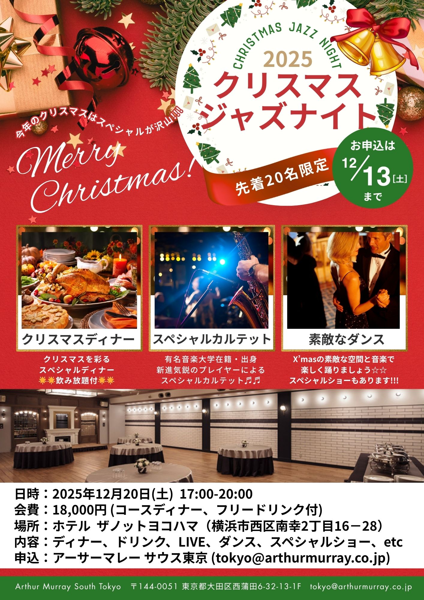 2025.11.20 |イベント情報【EVENT】 Christmas Jazz Night 前ページ INFO一覧へ戻る Category アクセス【ACCESS】 イベント情報【EVENT】 お知らせ【NEWS】 キャンペーン スケジュール【SCHEDULE】 スタッフ紹介【STAFF】 ダンス紹介【DANCE】 ブログ メディア掲載 New Article 2025.11.20 Christmas Jazz Night 2025.11.20 2025.12 Schedule 2025.10.18 FallDanceFestival2025 2025.10.18 2025.11 Schedule 2025.09.04 Bon Voyage Party!