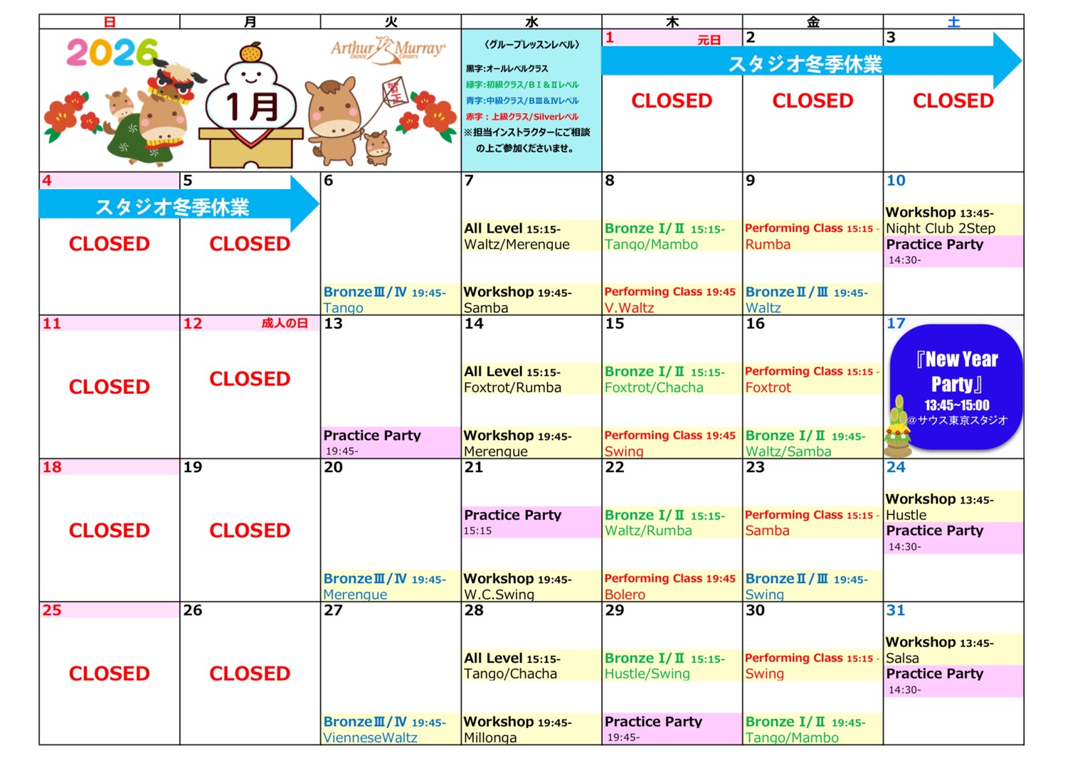 2025.12.20 |お知らせ【NEWS】 2026.01 Schedule 前ページ INFO一覧へ戻る Category アクセス【ACCESS】 イベント情報【EVENT】 お知らせ【NEWS】 キャンペーン スケジュール【SCHEDULE】 スタッフ紹介【STAFF】 ダンス紹介【DANCE】 ブログ メディア掲載 New Article 2025.12.20 2026.01 Schedule 2025.11.20 Christmas Jazz Night 2025.11.20 2025.12 Schedule 2025.10.18 FallDanceFestival2025 2025.10.18 2025.11 Schedule